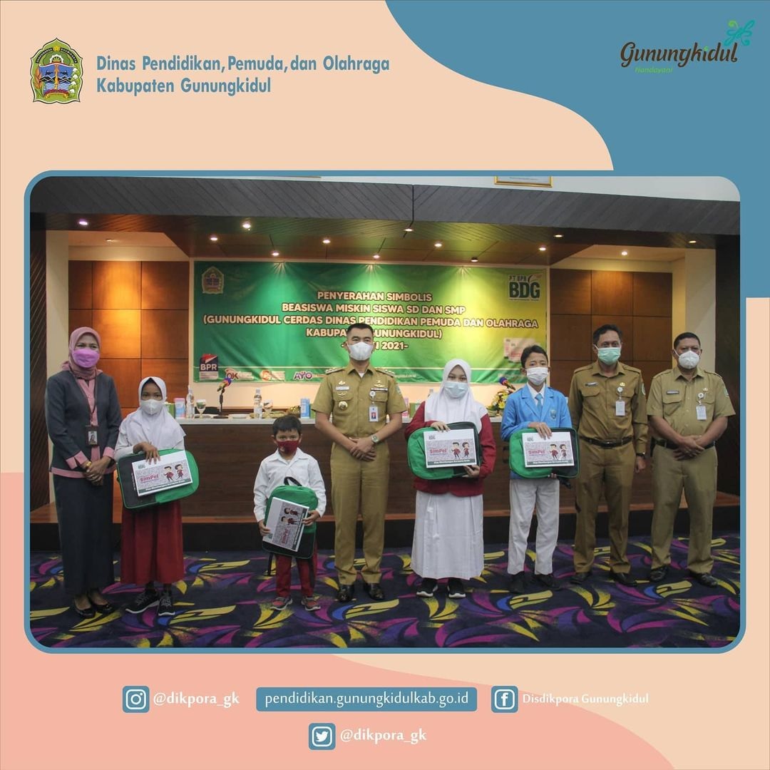 PLT. DINAS DIKPORA KABUPATEN GUNUNGKIDUL MENDAMPINGI H. SUNARYANTA BUPATI GUNUNGKIDUL DALAM KEGIATAN PENYEAHAN SECARA SIMBOLIS BEASISWA MISKIN SISWA SD DAN SMP GUNUNGKIDUL CERDAS